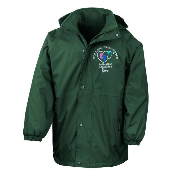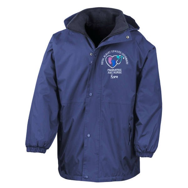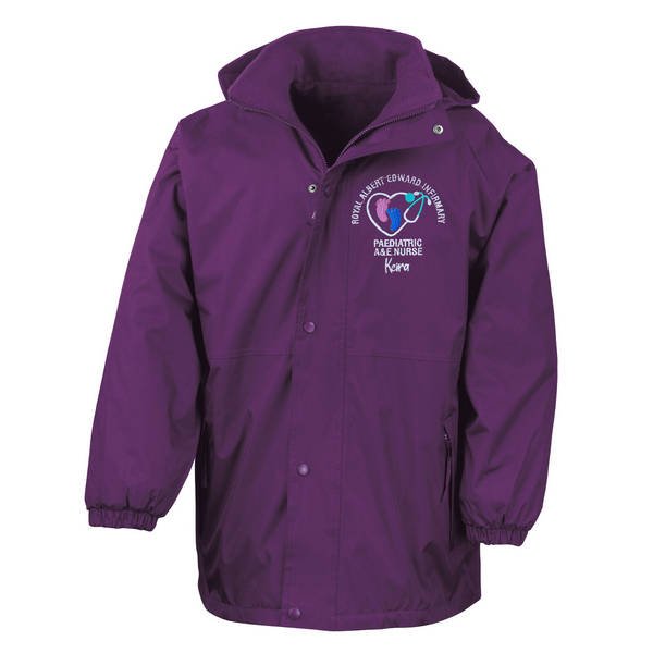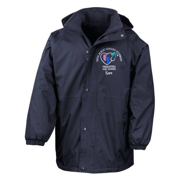 To order your personalised Healthcare Nursing Stethoscope & Baby Feet Design Waterproof Coat, please select your size and colour. Then use the text boxes provided to supply what you would like us to stitch on your soft shell.